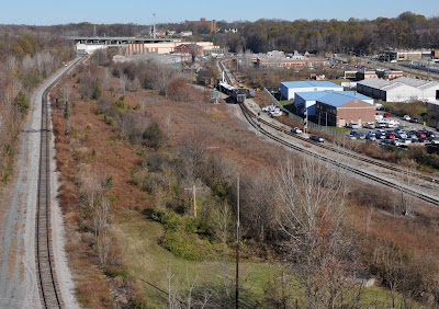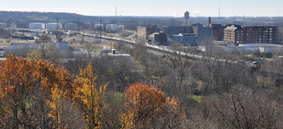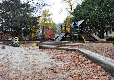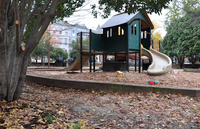 Toddler playground is right nearby the big playground; equipment is faded and worse for wear, which creates a dreariness. This angle is a from a fence.